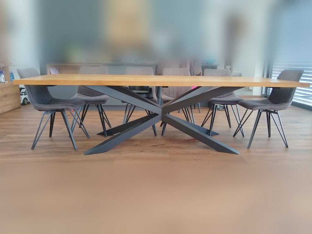Jídelní stůl EKS představuje kombinaci kvalitního masivního dřeva a moderního designu. Ikonický a jedinečný design podnože jistě všechny zaujme. Je ručně vyrobený čímž představuje jedinečnost a originalitu. Jeho masivní dřevěná deska je silná a odolná, zatímco nohy z oceli zajišťují stabilitu a robustnost. Stůl je vhodný pro rodinné i přátelské sezení u jídla. Nabízí stylový a elegantní vzhled, který bude ozdobou každé jídelny nebo obývacího pokoje.